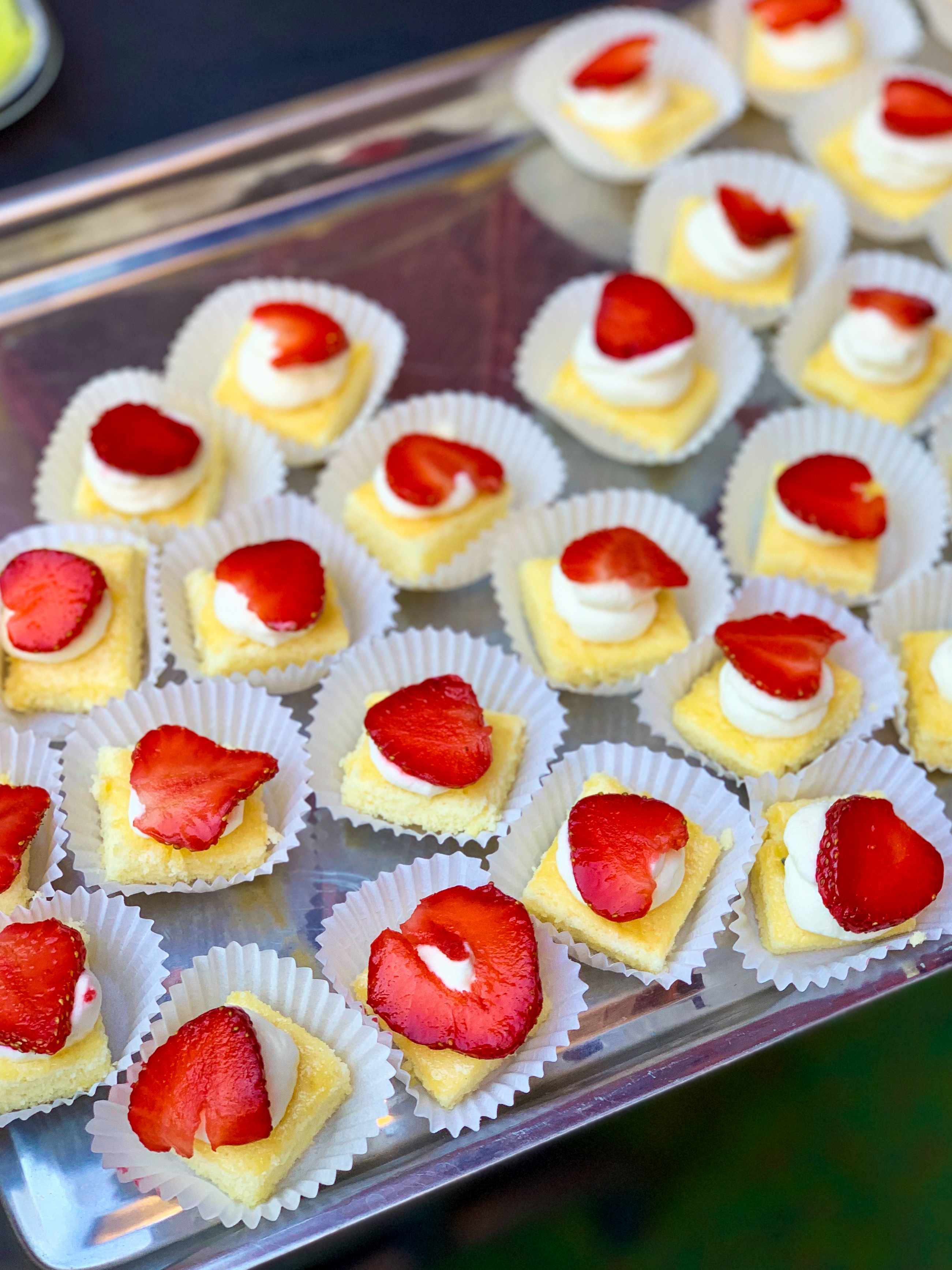Also, FWIW, if you’re looking for inspiration: Two weeks ago, I halved the cake recipe, baked it in one thin layer in a 10×15-inch jelly roll pan, cut it into 1-inch squares, placed each in a mini-muffin liner, dolloped each with whipped cream, and placed a slice of very ripe strawberry on top for a potluck. It looked like this and really didn’t take much time at all.