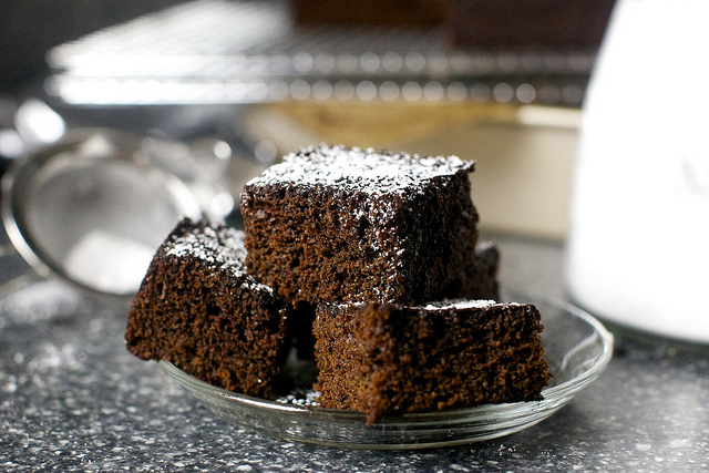 The first is that if you put this out in small squares, dusted with powdered sugar and in proximity to a hand-whisked bowl of lightly sweetened schlag at a packed tree-trimming party, one by one, the handsome revelers will fall upon them, take a big delighted bite, and then you might out of the corner of your eye note that cheer melting from faces into a brief pang of surprise as they realize that no, that was not a brownie, but an extremely dark and intense square of gingerbread cake. Oopsies?
