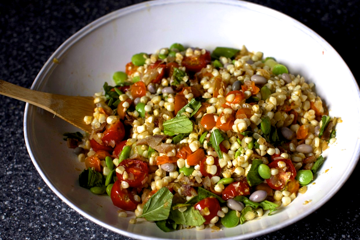 summer succotash with bacon and croutons