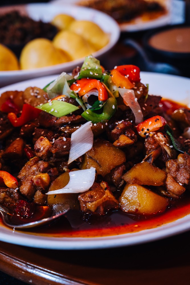 Chopped chicken legs in a pool of dark, aromatic chili sauce, on a bed of chewy, hand-pulled noodles. This is a full meal—and then some.